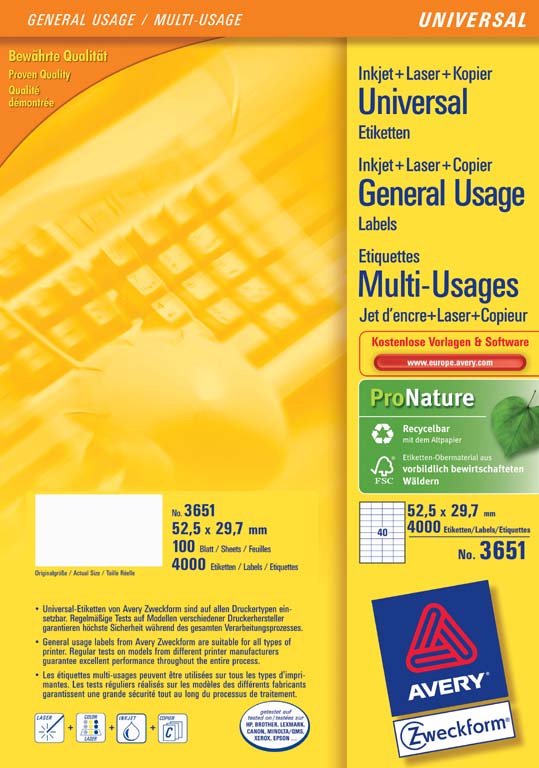 Главная особенность наклеек Avery-Zweckform в том, что потребитель может самостоятельно оформить и распечатать их на любом принтере или копировальном аппарате в неограниченном количестве. Наклейки совместимы с любыми струйными или лазерными принтерами и копировальными аппаратами. Гарантированное качество печати на всех марках офисной оргтехники. Такая универсальность достигнута благодаря новой структуре бумаги, разработанной специалистами компании, и применению технологии, исключающей загрязнение аппаратуры микрочастицами клея. Диапазон применения: от этикеток для конвертов до применения на производстве, маркировки и т.д.